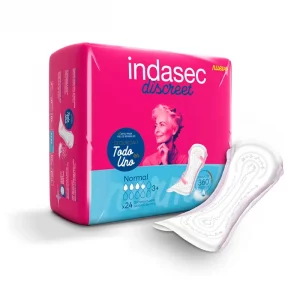 - INDASEC DISCREET se presenta en distintas versiones (mini, normal, extra y maxi) que permiten ajustar la absorción según la necesidad del momento. Estas compresas cuentan con canales antifugas, control de olor y una forma anatómica que garantiza la adaptabilidad y el confort.